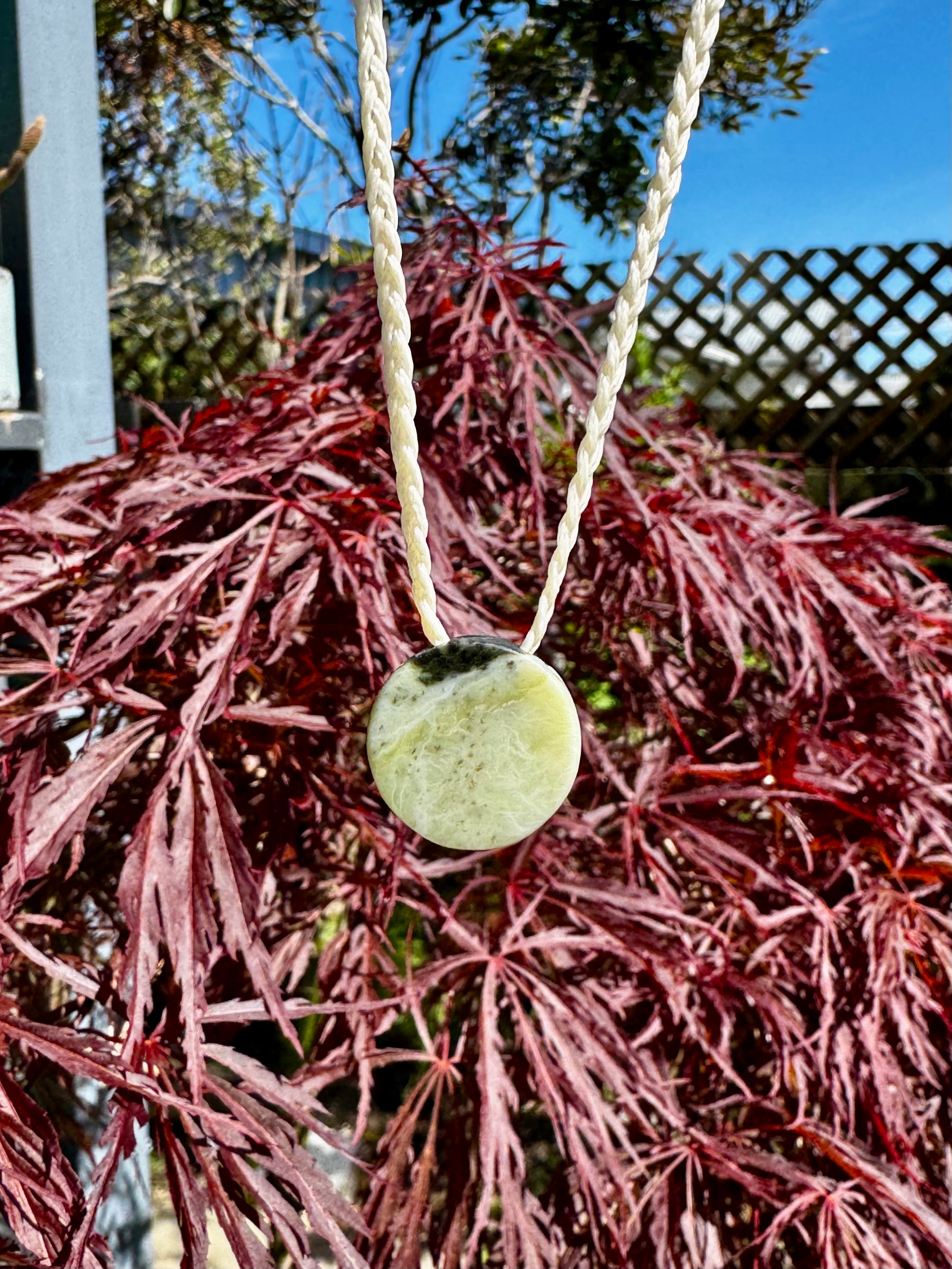 This pendant is strung on an adjustable 3 plait olive polyester cord.